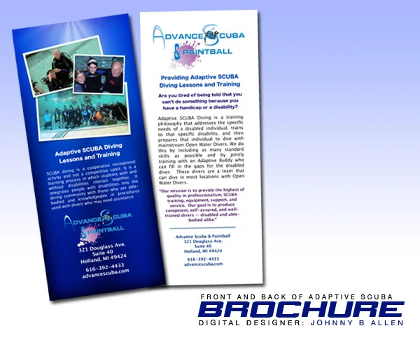 Advance Scuba & Paintball needed a professional brochure for its new endeavor with Adaptive Scuba diving lessons and training. The client provided their logo and 1 photo. Evolving Creativity color corrected and retouched the photo, removing red eye. The other photos used were captured from video shot during their diving session. The copy for the brochure, written by Evolving Creativity, was inspired from Adaptive Scuba foundations and other training centers. Other graphical elements were created in Photoshop. The final layout was converted into a PDF and given to the client for digital printing.