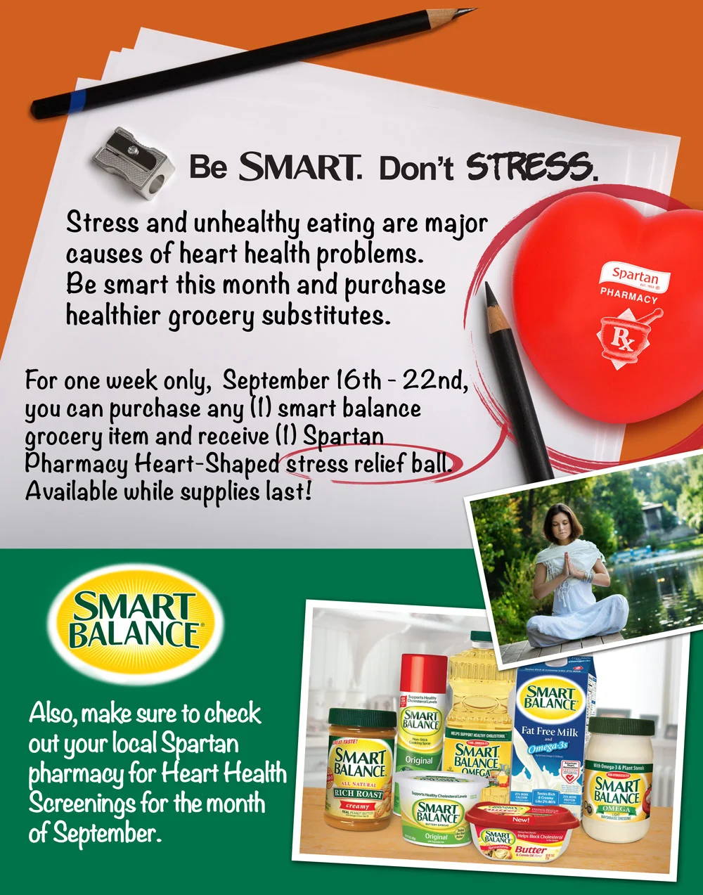The Spartan Stores marketing team turned to Evolving Creativity LLC for a poster layout it needed for a Smart Balance products campaign promotion called "Be Smart. Don't Stress". The poster was displayed in the Pharmacy department, where customers would pickup a stress relief heart-shaped ball.