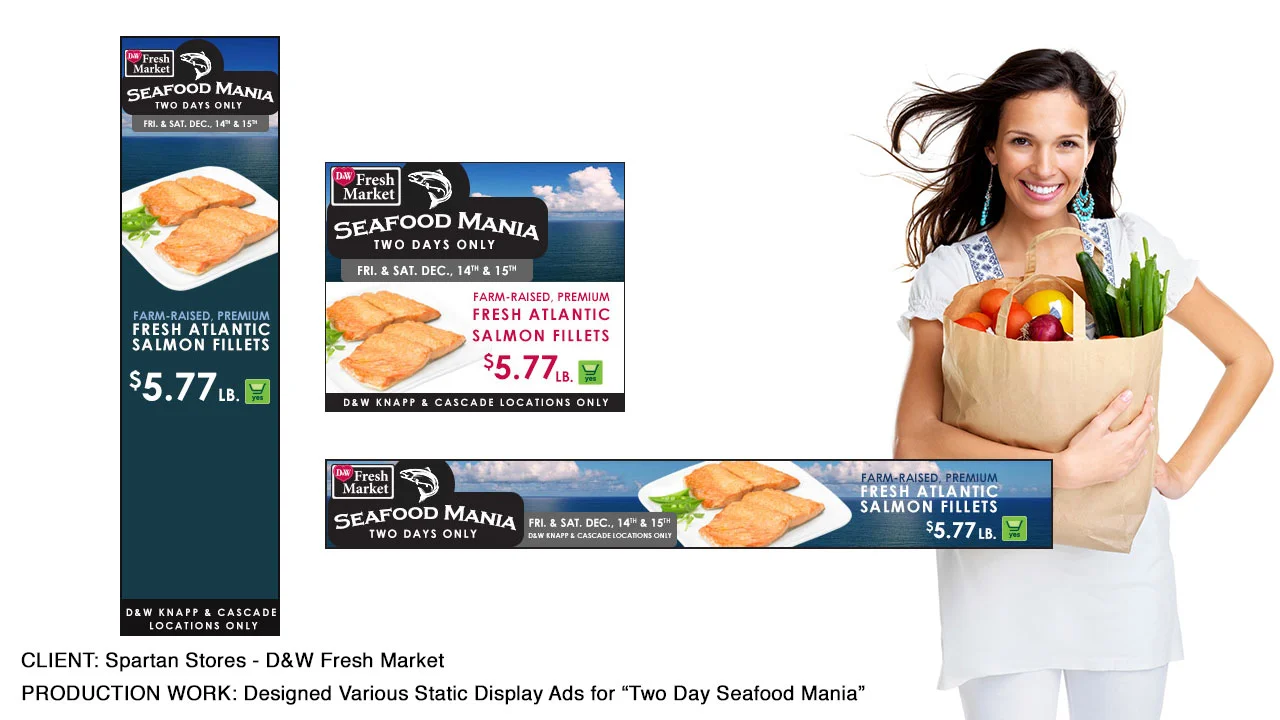 These static display ads were designed for Spartan Store's D&W Fresh Market's two day "Seafood Mania" Sale. Only element used from original marketing material provided from Spartan Stores was the cooked salmon photo, the D&W and "yes" logo. Everything else was new imagery or elements designed by digital media designer Johnny B Allen.
