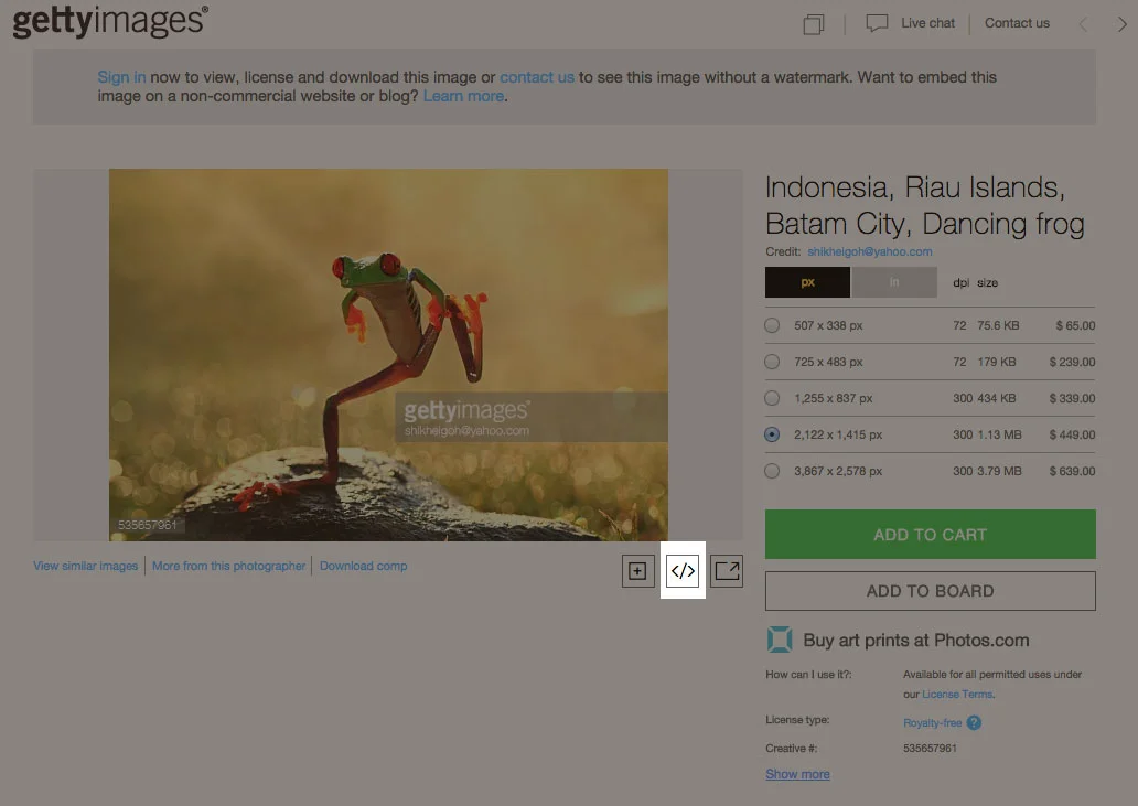 Search on GettyImages to find the image you like and click on it. Below the image will be a embed button looks like this </>. Click on the </> button to find the embed code. Choose the image size you want and copy the embed code and add it to your blog. Its that simple. If you are not sure how to use embed code for your